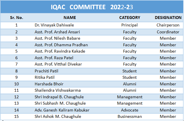 The institute has established IQAC as per National Assessment and Accreditation Council (NAAC)